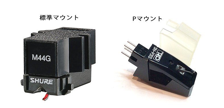 Pマウント:カートリッジの後方側面にあるネジでトーンアームの適した位置に固定。カートリッジの4本の突起によりトーンアームに直接接続できる方式で、Technicsブランドのターンテーブルで主に使用されています。