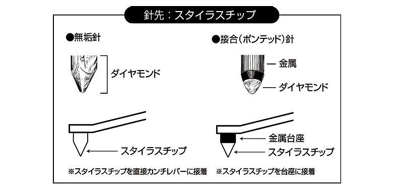 ダイヤモンドチップとカンチレバーの間を金属製台座で接合した針です。コストを押さえた生産が可能で、無垢針よりも重くなります。台座に使う金属によって優れたトランジェント特性を発揮するモノもあります。