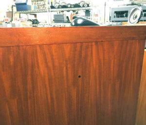 N500Hアッテネーター調整用のエンクロージャー穴。ステレオサウンド誌のハーツフィールドは左側面だがこちらは反対の右側面に開いている。