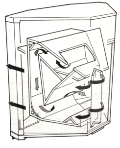 ハーツフィールド初期型の内部構造。複雑なフロントロード型構造の折り曲げホーンを採用し、部屋のコーナーに設置することで、両側の壁面や床面をイメージホーンとして利用する構造です。