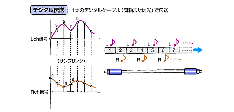 光デジタル端子はケーブルに光ファイバーを使用しているのが特長で、オプティカル(OPTICAL)とも呼ばれ、コネクタには角形コネクタと、丸型コネクタがあり、コネクタが異なる場合は変換アダプターで対応可能です。デジタル伝送の場合、もとのアナログ波形をサンプリングという処理によって左右別々に、トビトビの情報としてピックアップしているのです。その際LとRをそれぞれ「1、2、3、4……」とピックアップするのじゃなく、図の上下(LとR)を交互にスイッチングするように拾い出す。「L1、R2、L3、R4、L5……」といった具合です。この交互のデジタル信号はケーブル内を図のように、「L、R、L、R……」と仲良く交互に並んで伝わっていき、最後にD/A変換される際に「L君たちは左だよ、R君たちは右だよ!」という様に正しくチャンネル配分されてステレオ再生しています。