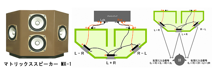 中央上部は「右」、中央下部は「左」、右側は「右マイナス左」左側は「左マイナス右」の再生を受け持ちます。