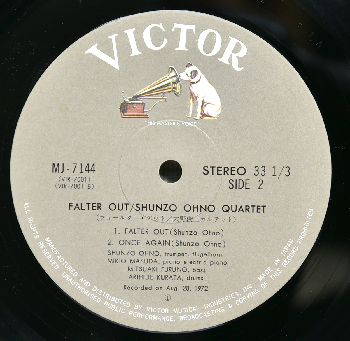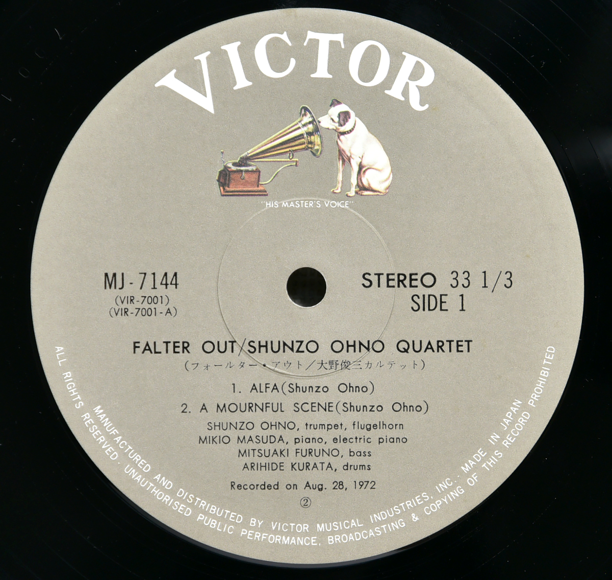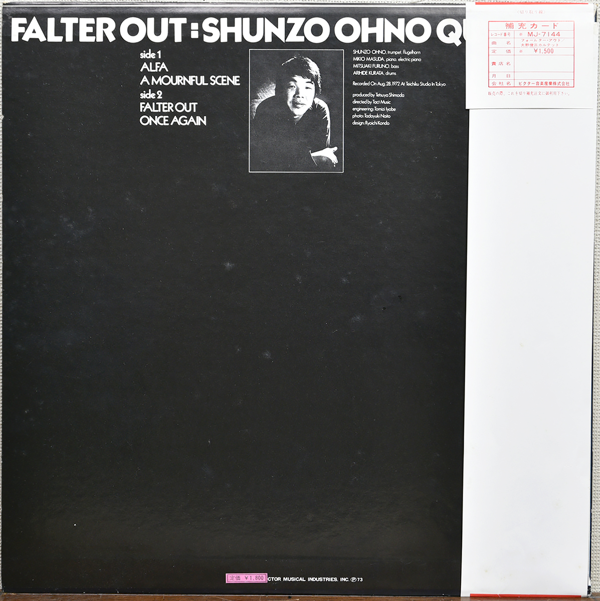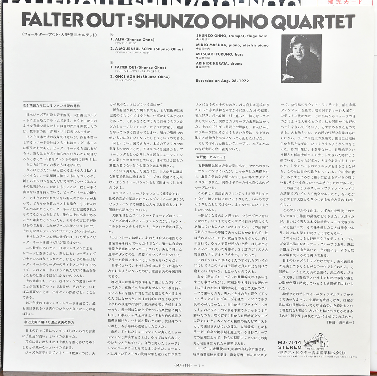 日本ジャズ史に残る名作、大野俊三カルテットによる「FALTER OUT」。1973年にVictorよりリリースされた国内オリジナル盤で、フリー〜モーダル・ジャズの文脈において極めて評価の高い一枚です。