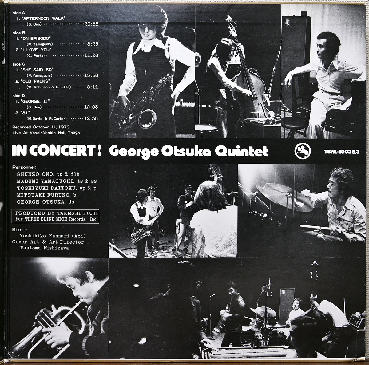 THREE BLIND MICEを代表するライヴ録音の傑作2枚組「イン・コンサート!」。ジョージ大塚五重奏団のダイナミズムと緊張感を余すところなく捉えた名演で、ライヴならではの熱量とインタープレイが全編を貫きます。大野俊三、山口真文ら実力派メンバーが揃い、TBMライヴ作品の中でも特に評価の高い重要タイトルです。