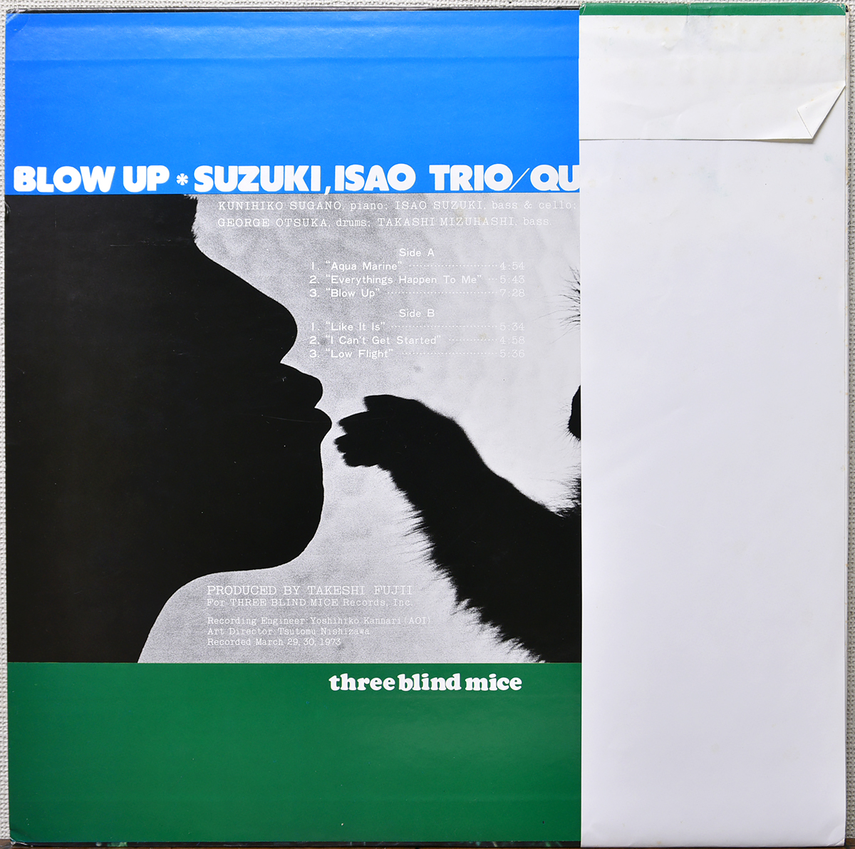 TBM three blind mice 初期を代表する名盤として知られる、鈴木勲の傑作アルバム。ベースに加えてチェロを導入した意欲的な作品で、ジャズ・ベースの枠を大きく超えた独自の音楽性が強く打ち出されています。菅野邦彦によるフェンダー・ピアノとの緊張感あふれる絡みも非常にスリリングで、「アクア・マリーン」「ブロー・アップ」といったオリジナル曲はTBM屈指の名演として高い評価を受けています。スタンダード曲においてもTBMらしい緻密なアレンジと音の良さが際立ち、録音クオリティを含め国内外で評価の高い1枚です。