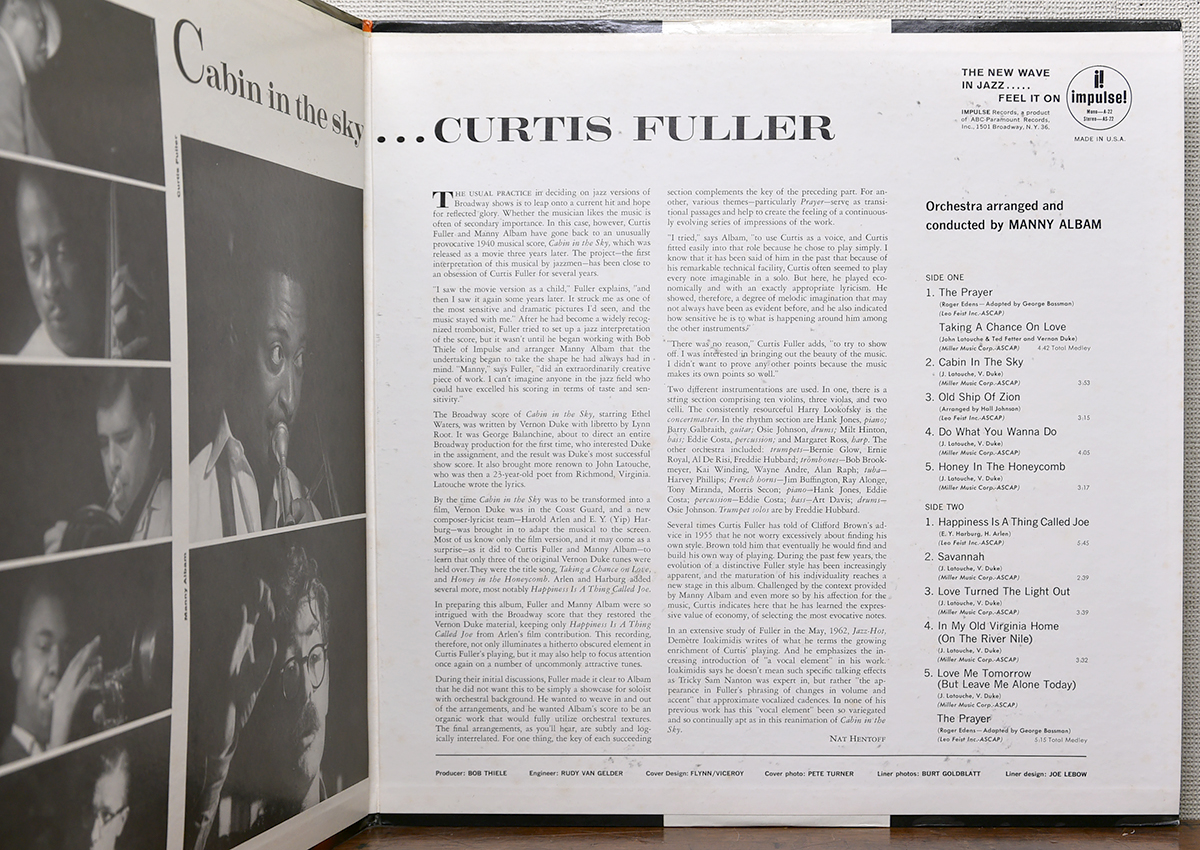Impulse!の人気作として知られる、Curtis Fullerによるオーケストラ作品「Cabin In The Sky」。Manny Albamのアレンジ/指揮による厚みのあるアンサンブルの中で、Fullerのトロンボーンが映える好内容です。メドレー「The Prayer / Taking A Chance On Love」や「Happiness Is A Thing Called Joe」など、ミュージカル由来の楽曲をジャズ・オーケストレーションで聴かせる1枚で、US Impulse!らしいムードもしっかり味わえます。